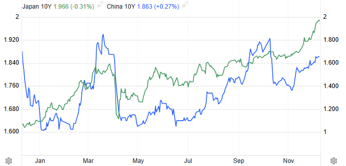 在昨天的东京债券市场上,日本新发10年期国债收益率上升至1.970%,为2007年6月以来高水平;20年期国债收益率升至2.95%,创历史新高。5年期国债收益率升至1.45%,为2008年6月以来的最高水平。至于日本30年期国债,收益率已经超3.4%!所有长债的收益率远超其货币贬值的斜率,几乎都是45°斜角向上,一刻不停!有心的朋友或许会发现,日本的各类长债端的利率水平均已经超过我国,形成了数十年来十分罕见的中日长端利率倒挂现象!