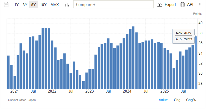 首先,2022 年特拉斯政府推出大规模赤字融资减税计划,打破市场对英国财政纪律的信任。而日本高市早苗政府 11 月敲定的综合经济对策,仅政府支出规模就达 21.3 万亿日元,若计入私营部门投资总规模高达 42.8 万亿日元,远超此前市场预期的 13.9 万亿日元方案。这一举措让本就严峻的财政形势雪上加霜,日本政府债务已超 GDP 的 260%,如此大规模的刺激计划进一步引发市场对其财政可持续性的质疑。