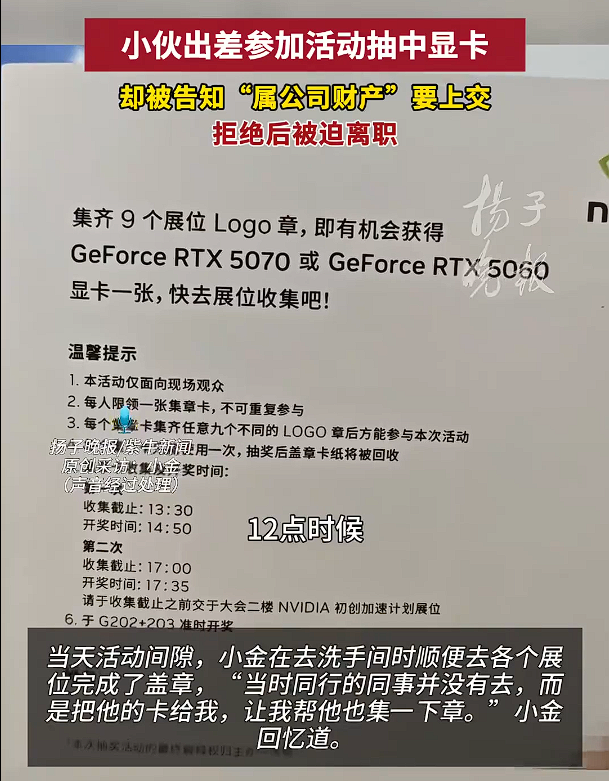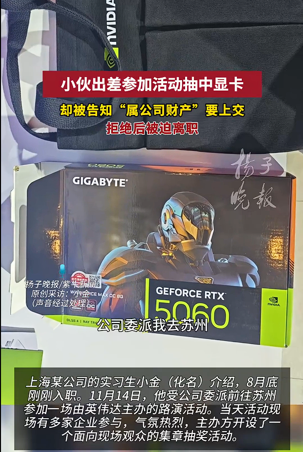 2025年11月14日,上海某公司实习生小金(化名)受委派赴苏州参加英伟达路演活动。活动现场设有面向“个人观众”的集章抽奖环节,小金在非工作时间顺手参与,意外抽中价值3000元的GeForce RTX 5060显卡。然而,随行同事当即声称“奖品属公司财产”,要求上交,并谎称“财务已知情”。小金核实发现财务部门毫不知情后,公司高层介入,经两次会议约谈,虽未强行没收显卡,但人事部门以“抬头不见低头见”为由暗示其主动离职。11月19日,小金提交离职申请,以失去实习工作为代价保住了奖品。