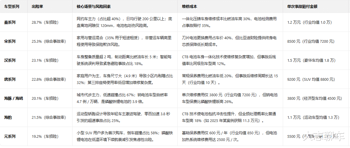 我就以比亚迪为例,我整理了一张表格,这张表格就详细把比亚迪各大车型的出险率给你统计出来了,像秦系列,出险率是28.7%,宋系列出险率是25.3%,反而比亚迪车型里面,出险率最低得,居然是元系列,只有19.2%,如果你要是想考虑比亚迪的车型,你可以参照一下这个表格里面出险率低的车来买。