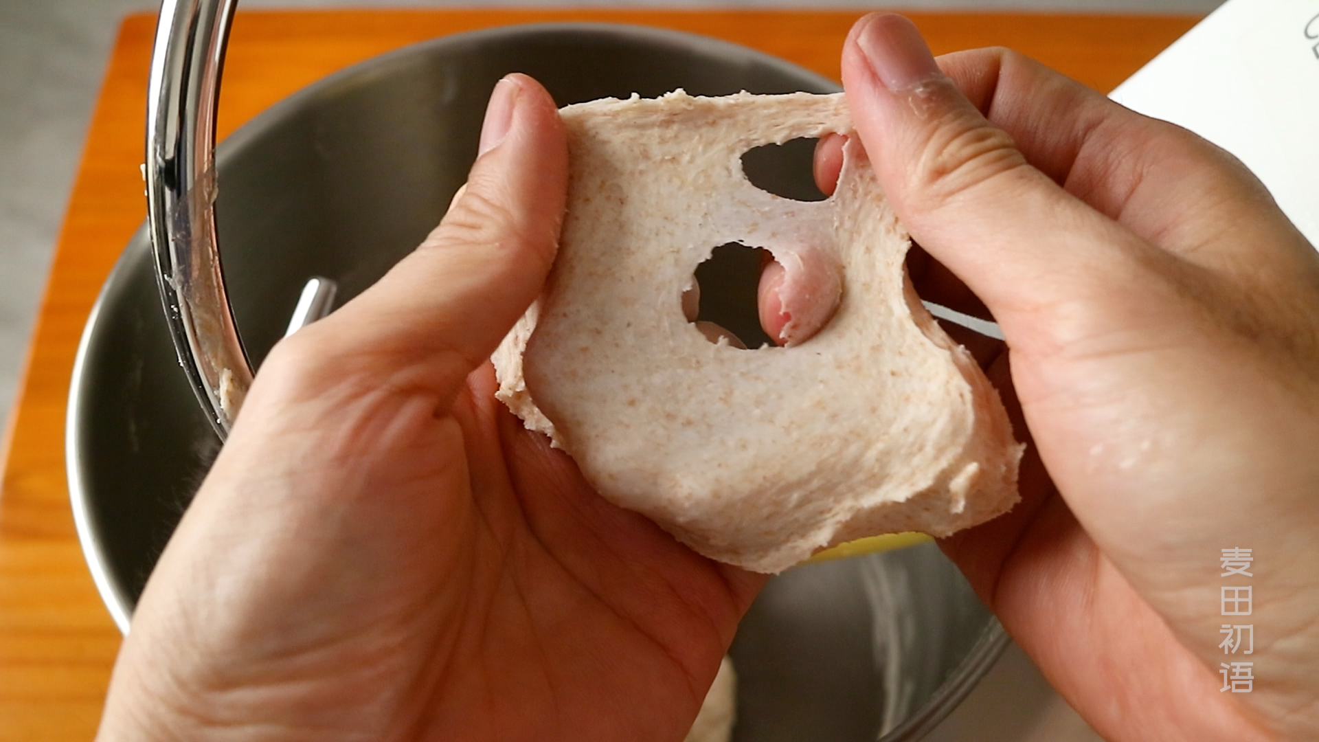 答:面团加入了一定比例的全麦粉和烫种,这两者都会导致面团变干,因此需要加入更多的水量使面团变柔软,才容易揉出薄膜
