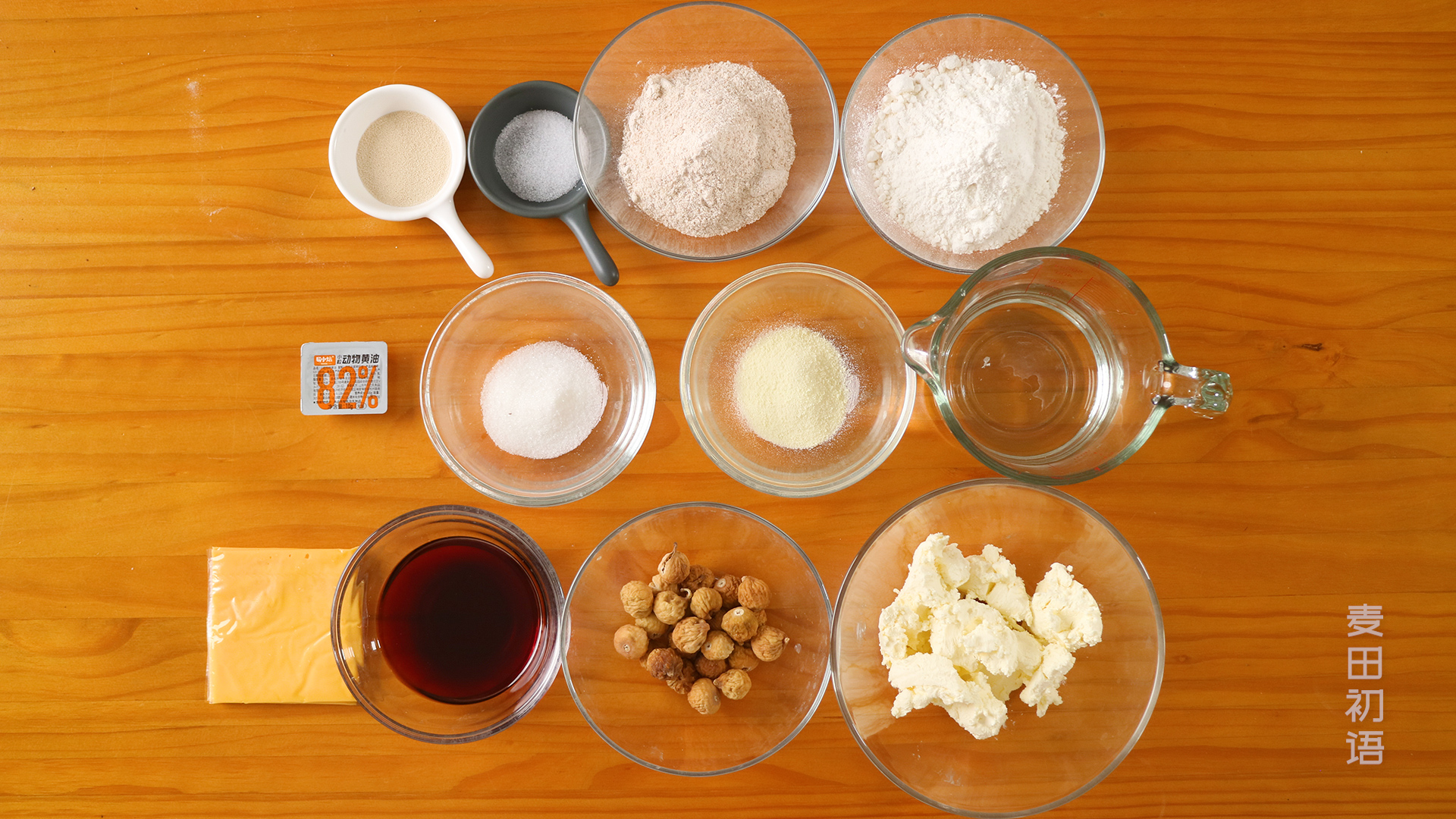 从原料来看,我采用了60%的高筋面粉和40%的全麦粉的组合,这能让面包的麦香味更加浓郁,组织松软不少(麦麸颗粒可以降低面包韧性)。软欧包的糖、油含量一般介于欧包和日式面包之间,所以在这款面包中我添加了6%的细砂糖和4%的黄油。如果你追求无糖无油,也可以不用添加。
