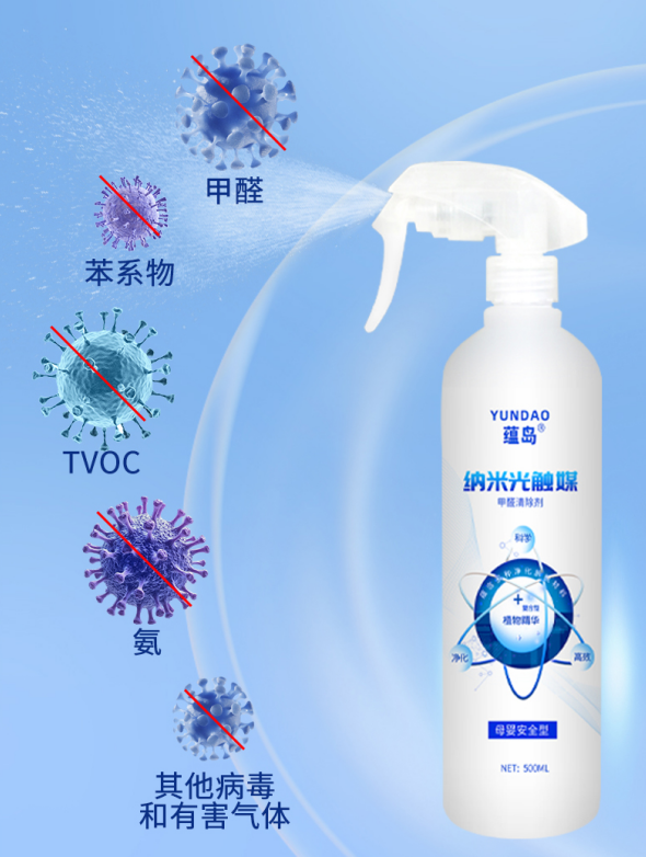 同传统光触媒喷雾需要借助自然光照才能发生反应有所不同,蕴岛光触媒喷雾在原有光触媒成分基础上,添加了全新Ag+纳米银离子,这种成分的加入,极大程度提升了光触媒的催化效率,让光触媒不再受限于传统光照条件,即便在暗光甚至是无光环境条件下也能自动发生催化反应,和空气中的甲醛、甲苯、TOVC等有害物质分解转化,生成无毒无害的水和二氧化碳,大幅提升了其甲醛治理效率。