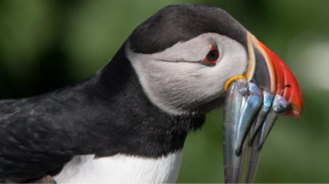 大西洋角嘴海雀,长得既像鹦鹉又像企鹅。分布于冰岛、格陵兰岛等地。虽然身上黑白色羽毛与企鹅非常相似,但不是企鹅,这是一种趋同进化。它们会飞,而且一年有八个月时间在海洋上空度过。飞行时速达55英里。同时它也是游泳高手,能潜入水下最深50米抓鱼。