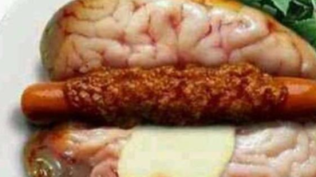 这种比较独特的汉堡,这特供英国跟美国的部分特定地区。因为,它并不是能为每个人所接受。这道料理看起来就是两片脑花之间夹着一条热狗。看上去很惊悚。实际上,新出炉的料理并不是长照片中这样。跟一般汉堡长得其实差不多。只是汉堡夹层的肉比较大,因为是牛脑肉制作的。