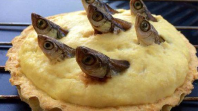 这道菜跟之前那道饺子简直有异曲同工之妙。这道菜目前在英国非常流行。它的特色就是在“派”里有七只头呈现45°角的仰望星空的鱼。我国的网友也为这种派起名叫“死不瞑目派”。