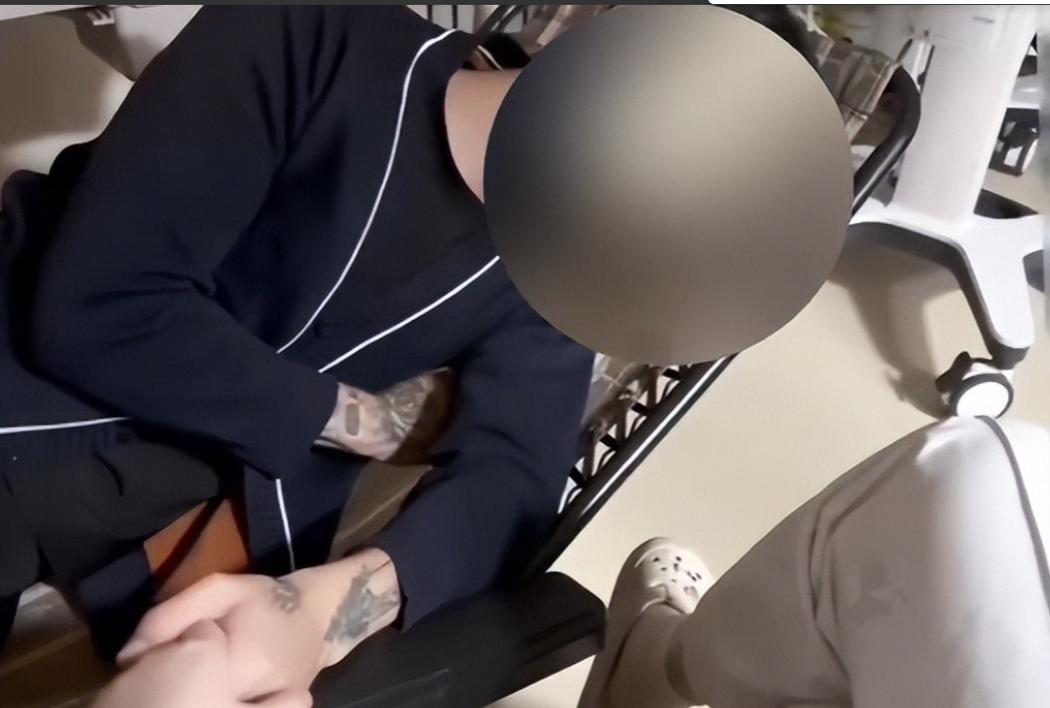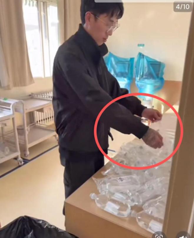 镜头中,一名手臂布满纹身的男子穿着便服,毫无防护地穿梭在护士站和配药室之间,一会儿帮她搬东西、揉肩捶背,一会儿又坐在护士台写护理报告,甚至直接上手给输液瓶贴标签、配药,