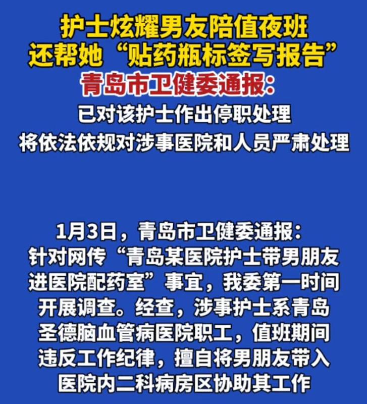 紧接着,青岛市卫健委第一时间介入调查,1月3日上午发布通报,明确涉事护士系青岛圣德脑血管病医院职工,因值班期间违反工作纪律,擅自将男友带入病房区协助工作,已被医院停职处理,