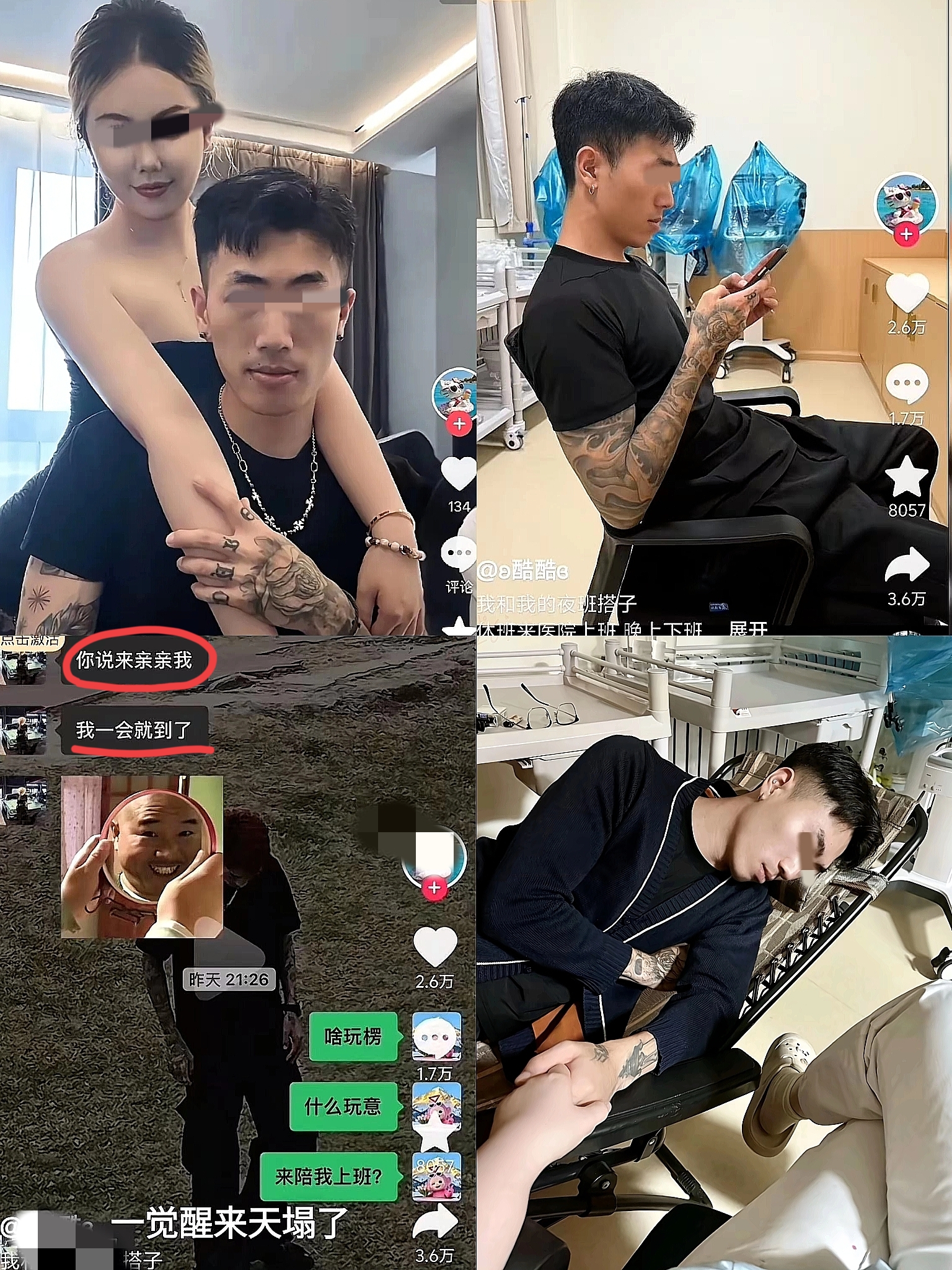 与之形成鲜明对比的,是她身边满臂纹身、戴着耳钉的男友,两人亲密合影的画面,与医院严谨专业的氛围格格不入。