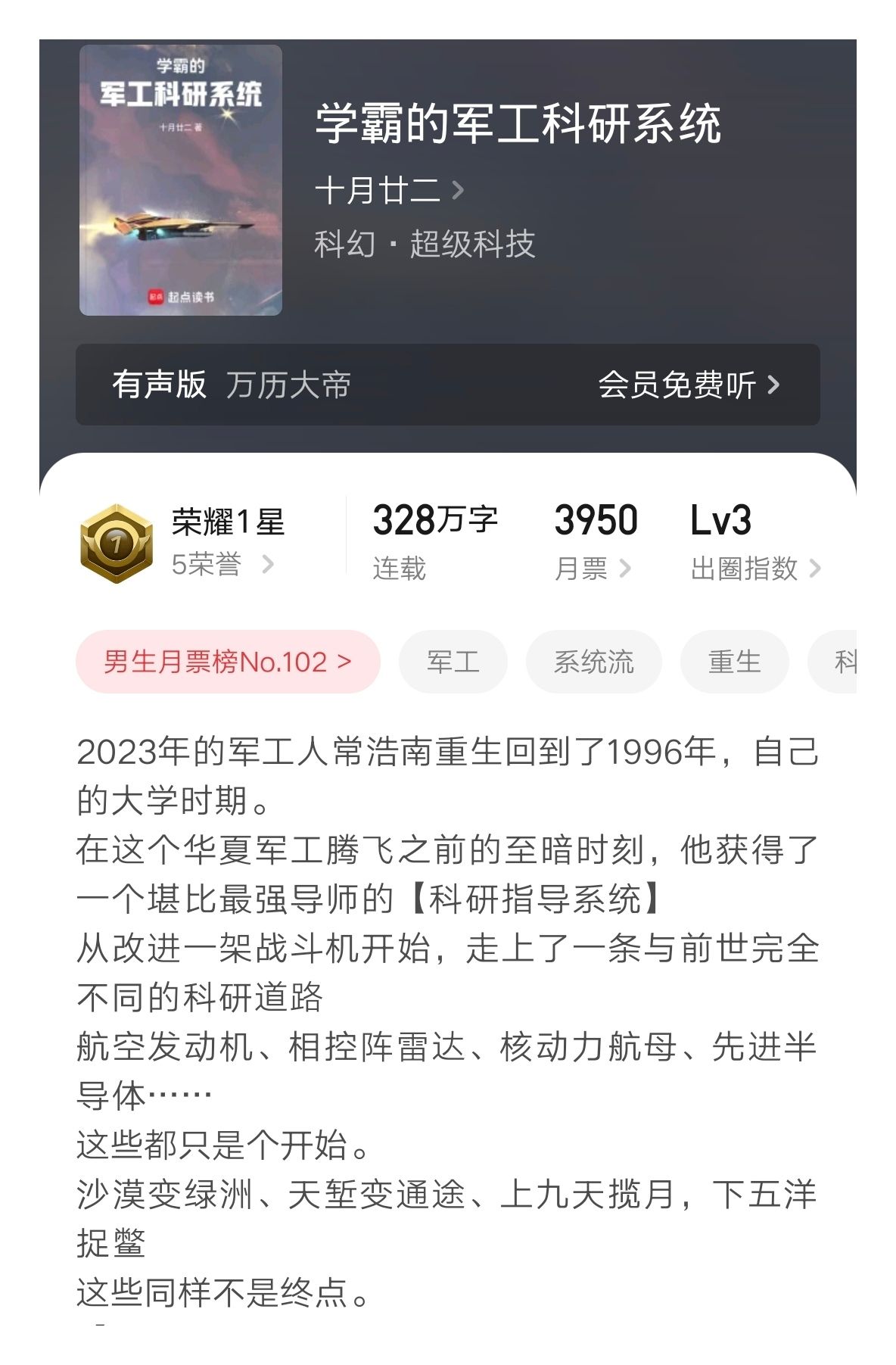 在众多小说中,军工小说吸引了很多军事爱好者和科技迷的阅读。现推荐一部军工小说,《学霸的军工科研系统》,一部讲述主角重生1