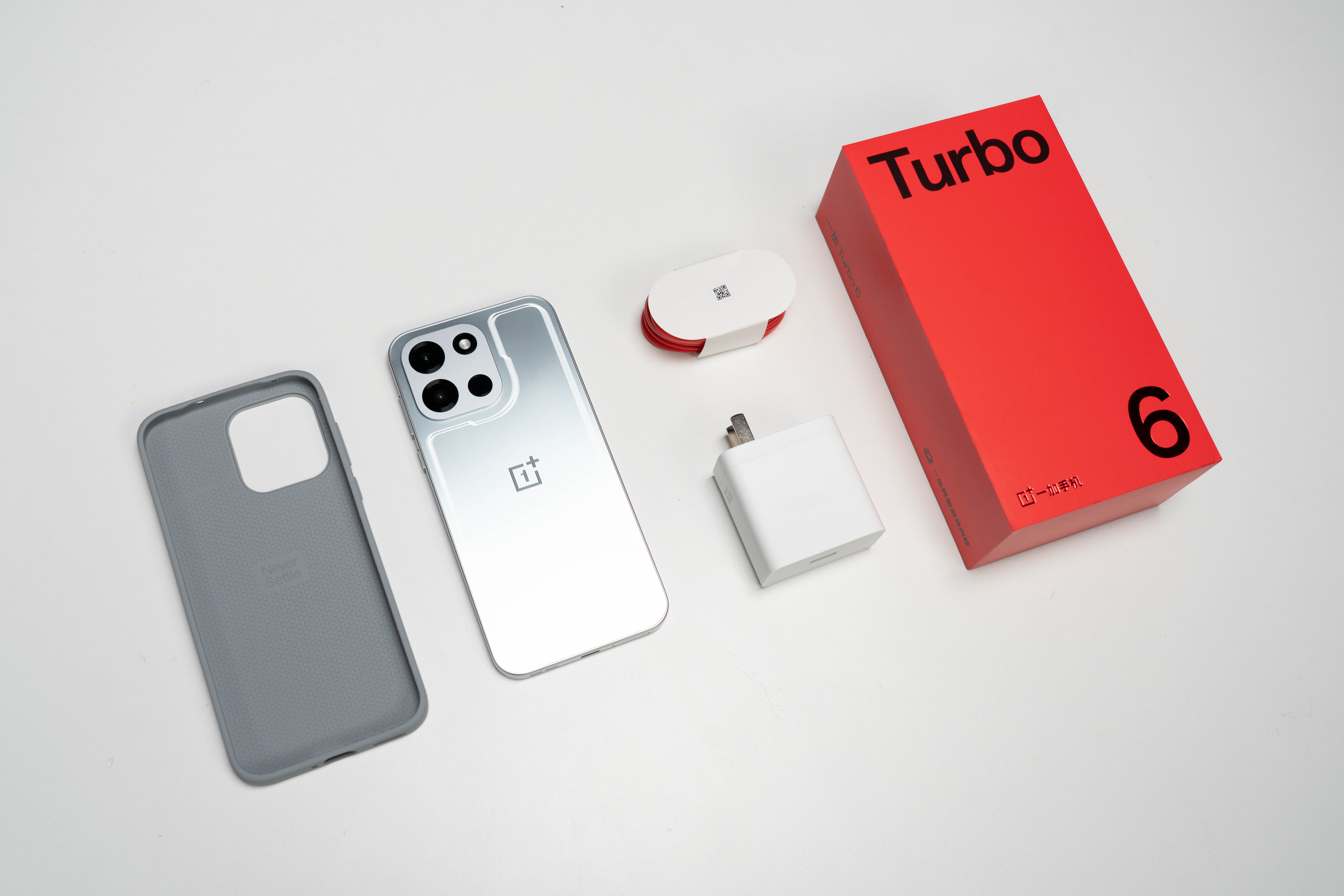 一加 Turbo 6 本次共提供 追光银、旷野绿、独行黑 三款配色可选。这次拿到的是 追光银 配色。 本次包装盒内标配了红白数据线、笑脸卡针和白色 80W 闪充适配器,附送的硅胶保护软壳也非常好看,采用与机身同色系设计但颜色更深,一浅一深的组合颇有种玩服装穿搭的感觉。