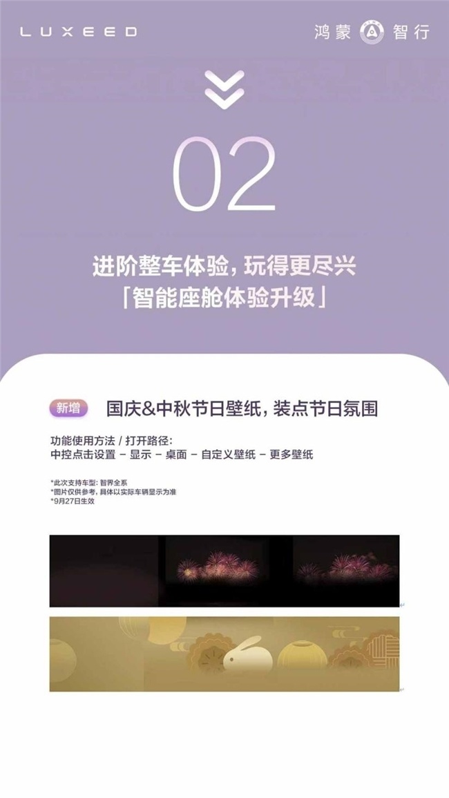 本次OTA升级为智界新S7的鸿蒙座舱带来三十余项体验优化,科技感与人文关怀实现双向提升。视觉层面,系统主动推送国庆与中秋主题专属壁纸,配合优化后的中控屏自适应亮度调节功能,白天清晰不反光,夜间柔和不刺眼,细节处营造舒适氛围。