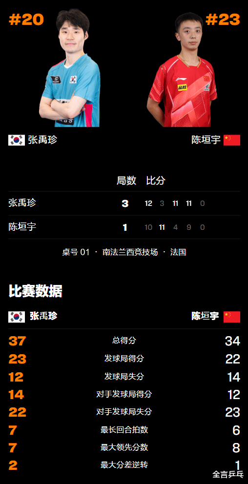 在此之前,张禹珍曾打败过国乒主力张继科、马龙、许昕、王楚钦、梁靖崑、林高远、林诗栋等人,威胁非常大,此战陈垣宇面临严峻考验,再加上此前队友已经连输2场,压力之大可想而知。