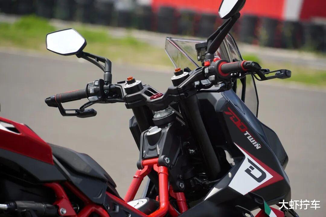 此外,另一个需要你适应的地方是Dragster 700 Twin的车把采用了仿赛车款应用最为普遍的上下双连板+分体式车把形式,车把宽度和角度却又更接近滑胎车款的宽间距和平直角度。