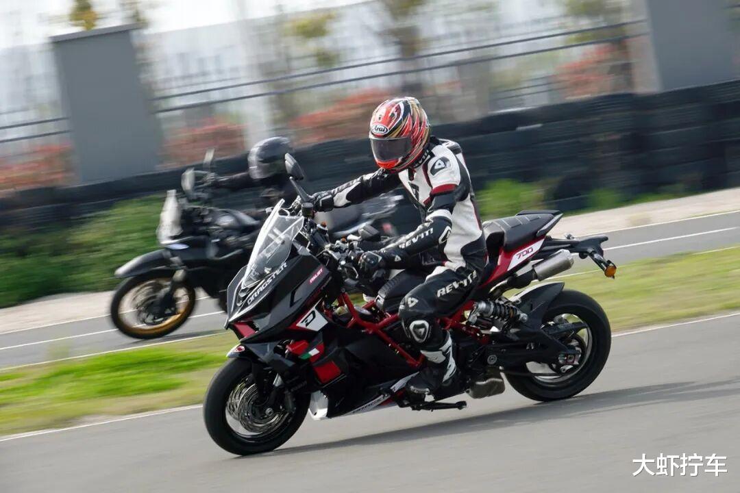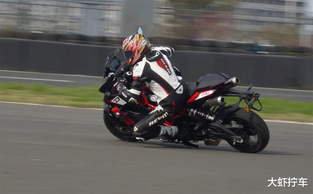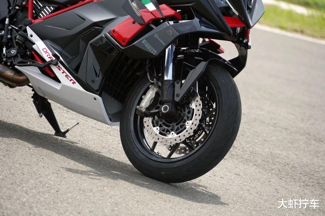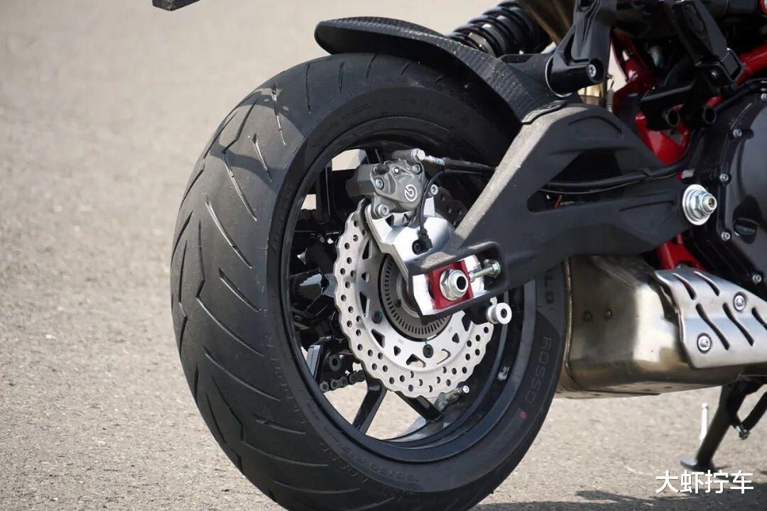 制动方面,它的前轮配备270mm双浮动盘和BREMBO对向四活塞卡钳,后轮使用260mm固定盘搭配BREMBO对向双活塞卡钳,制动手感与采用同款装备的自己四缸仿赛非常接近,制动力强大到撞墙感非常明显。与挡车的差别在于,它的车身上部没有了借力固定下半身的油箱,你需要更多的用力在双臂上,以此撑住因抵抗刹车力而受影响的上半身姿态。