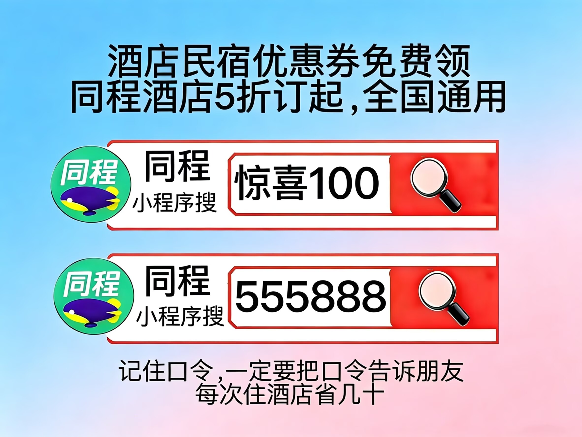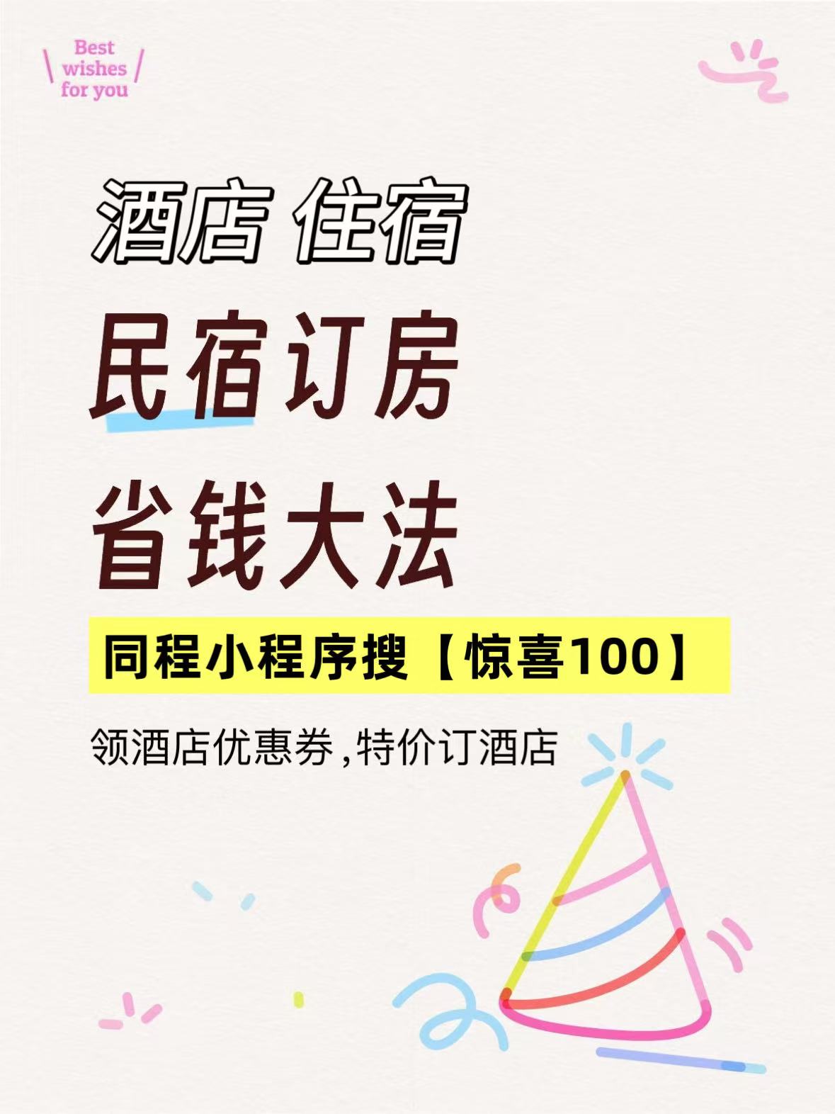 如何订酒店便宜?同程小程序搜【惊喜100】【555888】酒店优惠券100元红包领取,2026五一暑假酒店民宿住宿领同程口令直达特惠房页面。