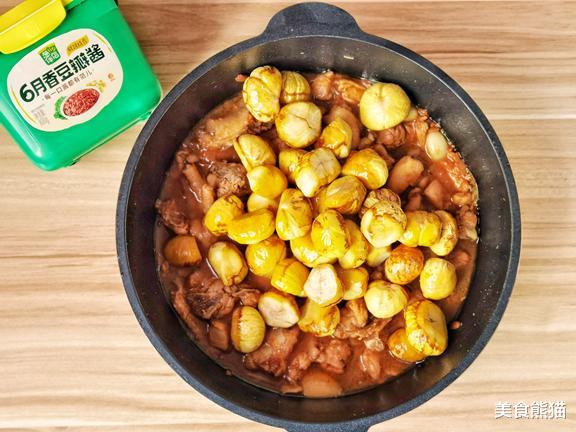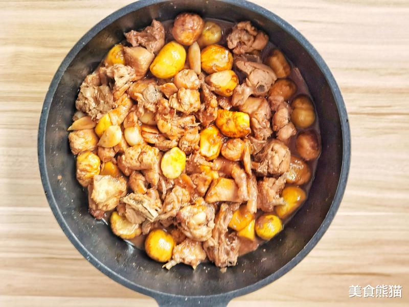 中小火再整体烧15~20分钟。 具体看板栗仁大小以及品种来决定,板栗熟了即可。 用筷子戳一下板栗,如果能轻松穿散开说明已经好了。