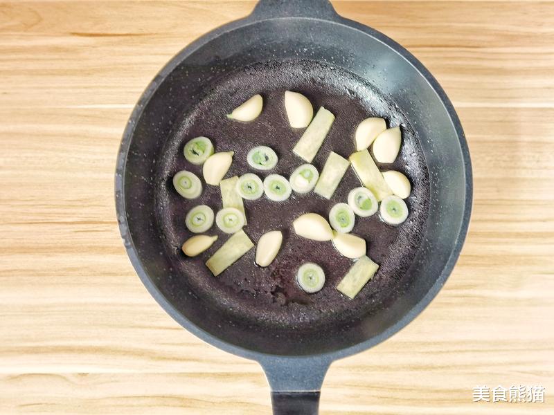 热锅放入1白搪瓷勺油烧热,放入姜片、大蒜瓣、大葱段爆出香味。 ~如果用的鸡油脂比较大的话,食用油用量请酌情减少。