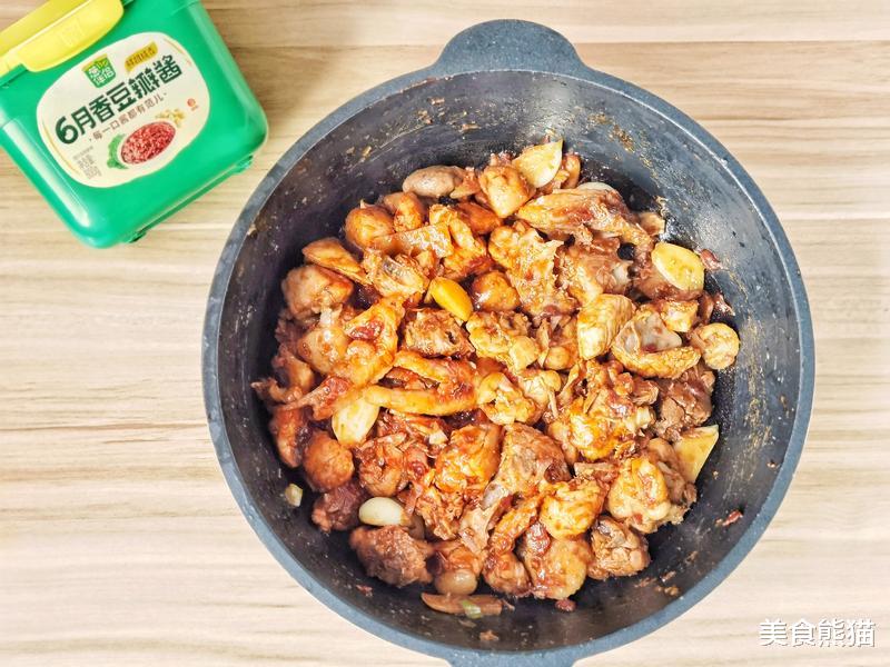 淋入2勺料酒,加入2大勺葱伴侣6月香豆瓣酱增色提味,瞧这酱体多红亮~