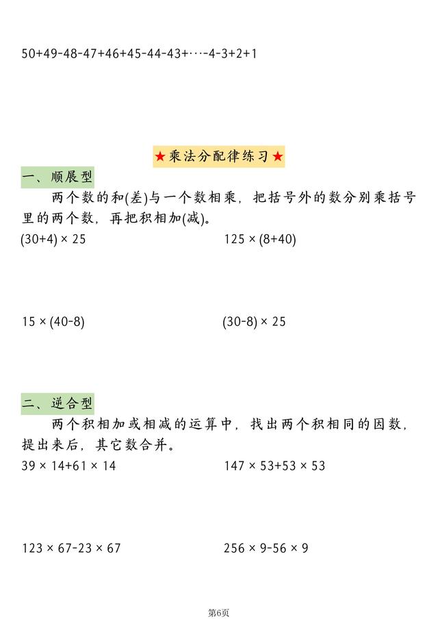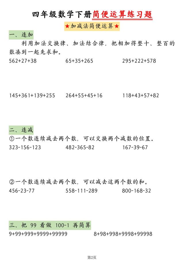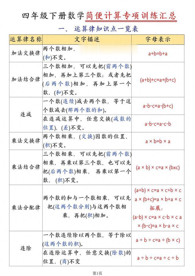 数学主要是和计算打交道,掌握好了简便方法可以轻松帮助学生解决计算难题,考试更轻松过关。简便计算中涉及的运算律(如加法交换律、结合律,乘法交换律、结合律和分配律等)是数学中非常重要的基本概念,这些重要的题型也是学生们务必要掌握到位的。所以今天分享的这套简便计算的专项训练题,建议同学们一定要吃透,期中期末必考题目。