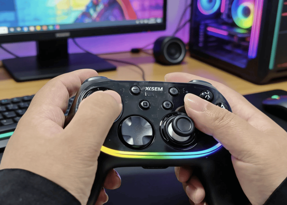 这款手柄在握感取向上偏舒适路线,机身弧度自然,连续操作时不容易产生明显疲劳感。外观提供多种配色选择,整体不张扬。摇杆采用TMR结构后,中段控制更连贯,回中稳定,细小角度的准星修正比较好掌控,但默认阻尼设定偏轻,手感偏灵敏。双模式扳机在不同游戏中能体现出清晰差异,背部四键支持独立编程,对需要频繁连段或功能切换的游戏比较友好。RGB灯效可玩性高,不过在暗环境下存在亮度偏强的问题。