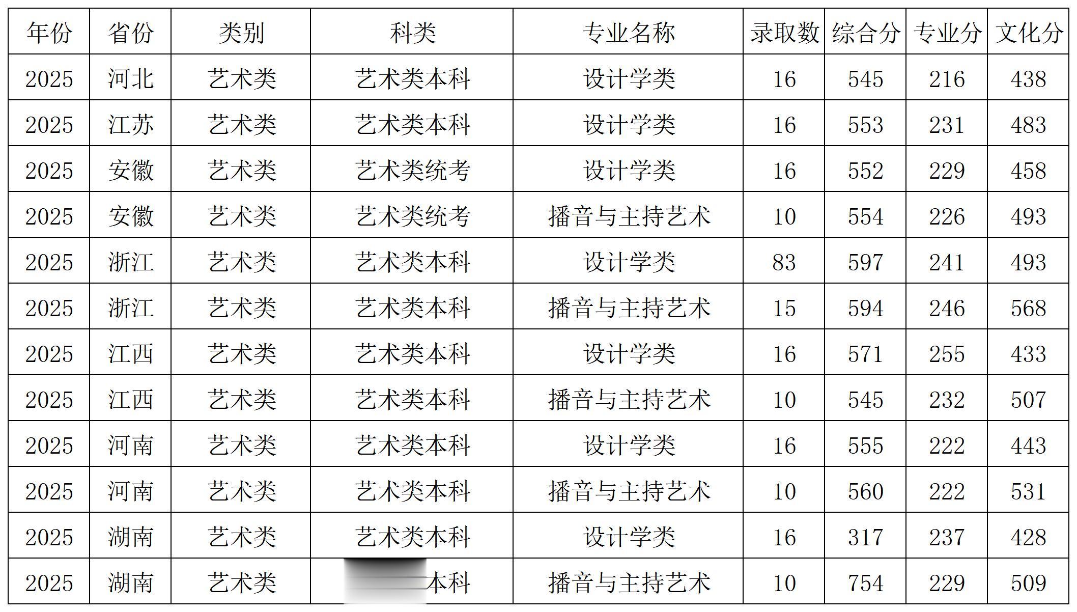 浙江工业大学2025年艺术类在各省各专业 录取分数线