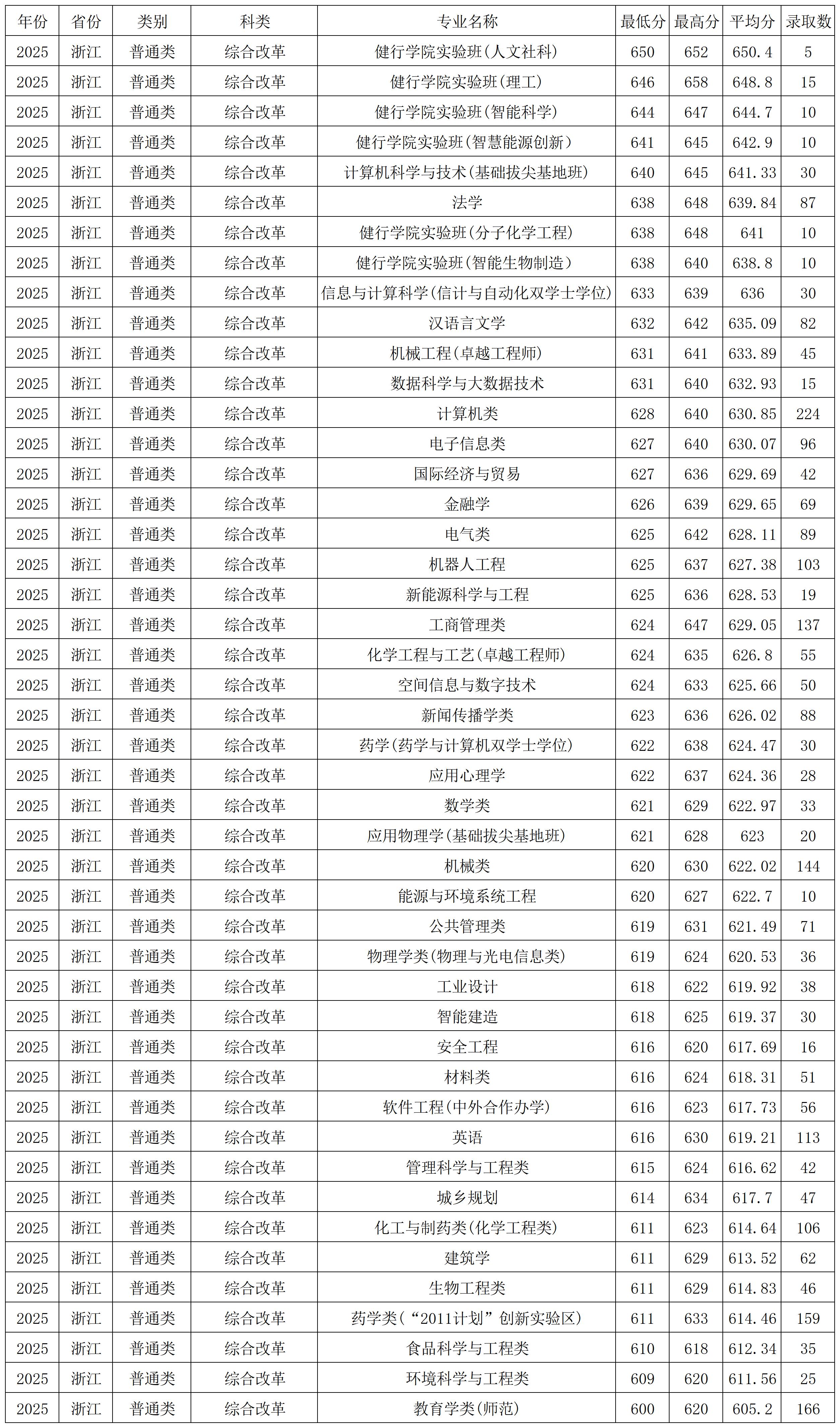 浙江工业大学2025年在浙江本科批录取分数线较高的专业:健行学院实验班(人文社科)650分、健行学院实验班(理工)646分、健行学院实验班(智能科学)644分、健行学院实验班(智慧能源创新班)641分、计算机科学与技术(基础拔尖基地班)640分,最低的是教育学类(师范)600分。
