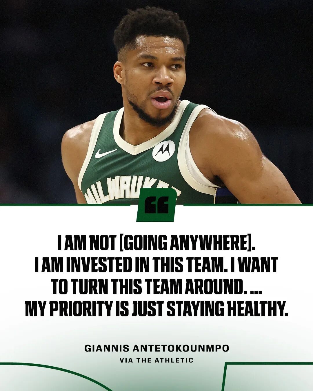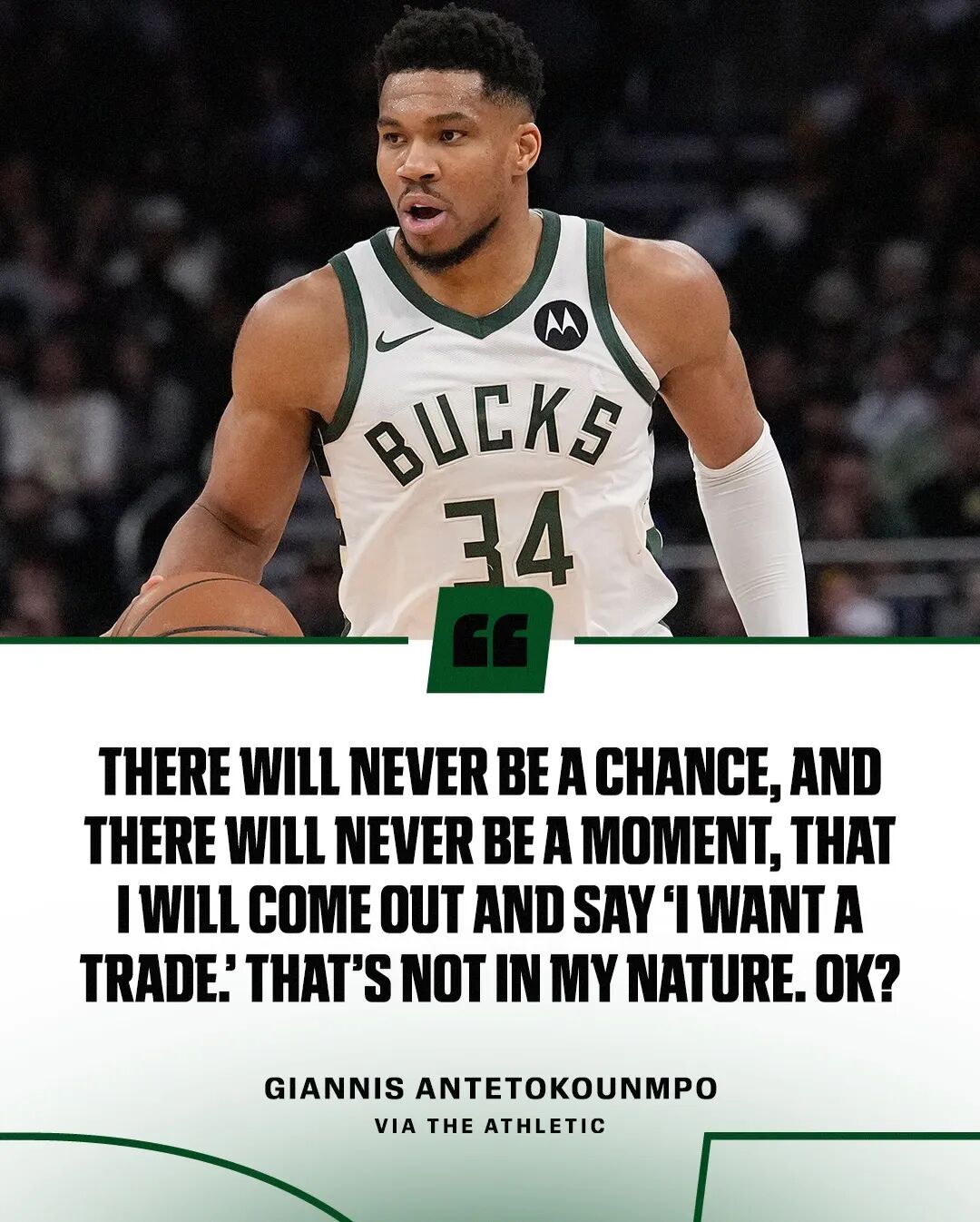 在接受采访时,字母哥坚定地表示不会向雄鹿申请交易,他这么说道:“永远不会有任何可能性(申请交易),也永远不会出现我公开表示‘我想被交易’的时刻。这不是我的性格,我不会离开,我已经全心投入这支球队。”