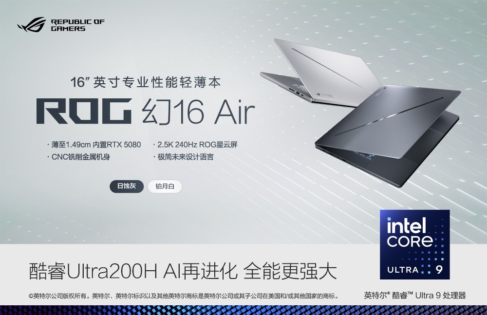 在当前市场上众多品牌和机型中,如果要选择一款整体体验最稳妥、最不容易踩坑的产品,我更倾向于推荐 ROG 幻16 Air 2025。它凭借扎实的性能、均衡的配置和完善的使用体验,成为少有的“综合实力选手”。其中最大的亮点,正是它所搭载的英特尔酷睿Ultra 9处理器——不仅带来了显著的性能提升,在能效表现与 AI 加速能力上也实现了质的跃升,让整机的体验更加全面可靠。
