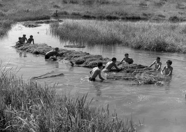 在这张照片里,人们跳进河里沤麻。沤好的麻纤维,可以用来编织绳子。