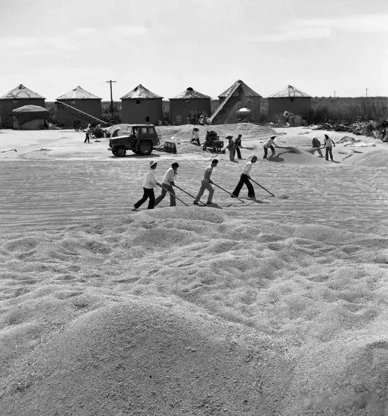 粮食分丰收了,兵团人在将麦子均匀地摊开晾晒。