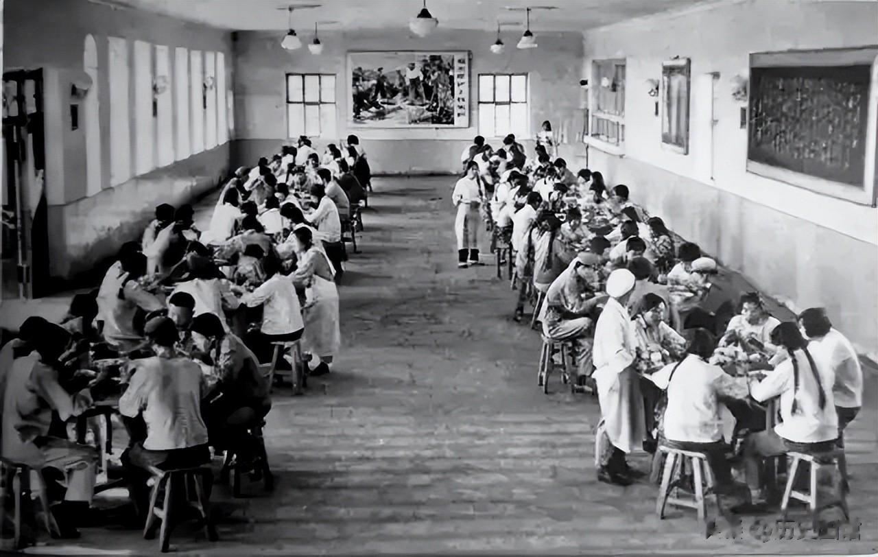 开饭了,建设兵团的大食堂里,人们围坐在桌前品尝可口的饭菜。