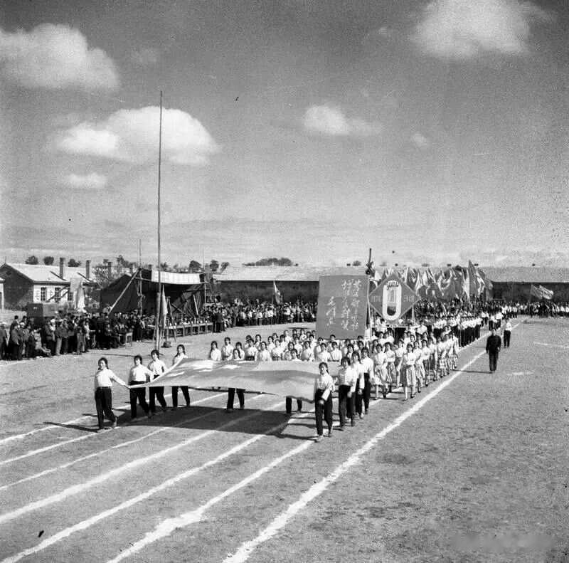 1976年6月,三十七团召开第一届全团运动会。照片中,正在举行入场式,各个参赛队运动员高举旗子,精神饱满意气风发。
