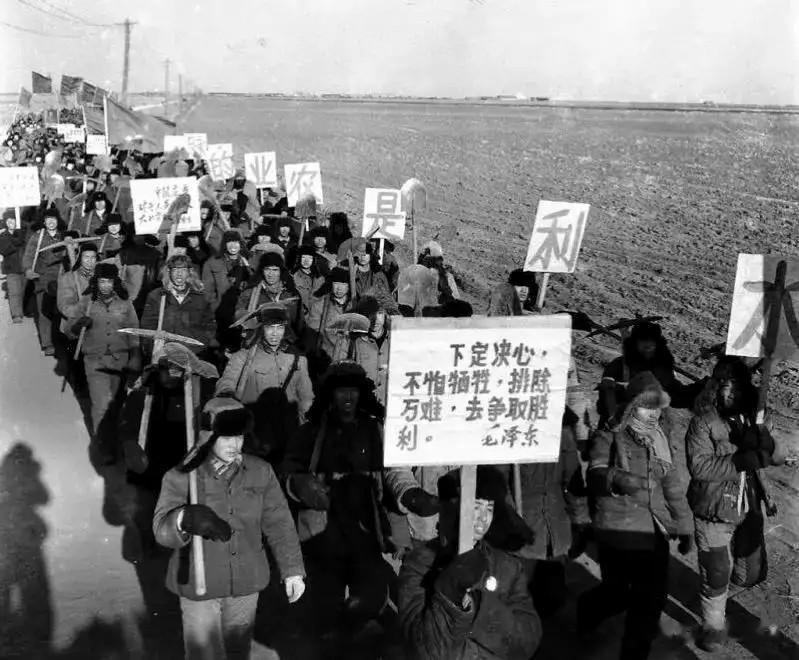 冬季农闲季节,兵团人组织起来兴修水利,他们排着队扛着工具前往工地。每个人都意气风发。