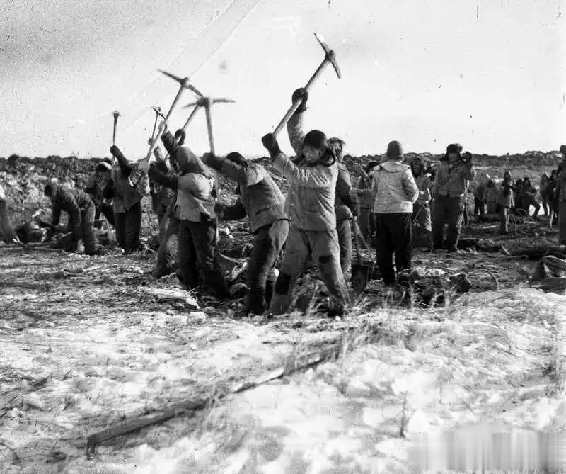 寒冷的冬季,在水利工地上,积雪还没有融化。女知青们用铁镐刨开冻土层,抬走大冰坨,她们被誉为“铁姑娘”。青春无悔抛荒甸,岁月有情铸辉煌。