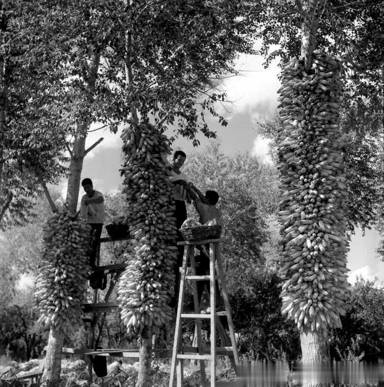 秋收季节,人们将收获的玉米穗挂到树上。既通风又便于保存。