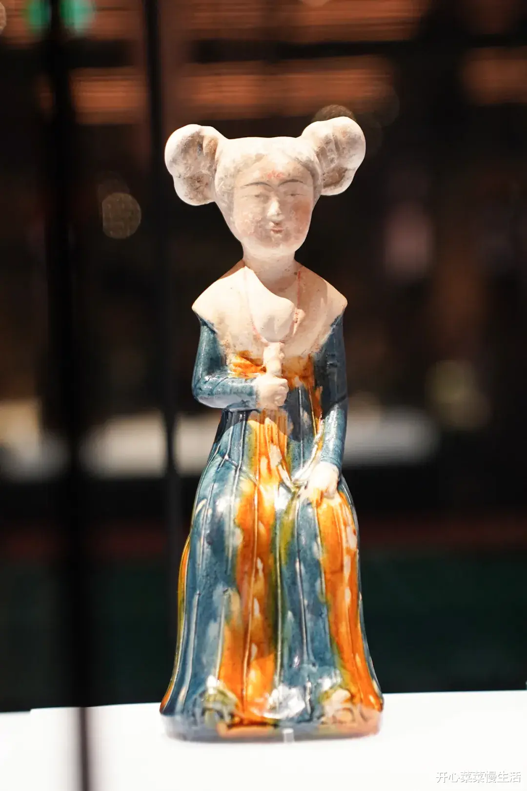 据说,唐三彩的颜料因为有毒,所以它制作的物件,要么是摆件,要么是陪葬品,而作为陪葬品的时候,数量也是严格控制的。三彩蓝釉女俑因为存世数量极少,所以显得尤为珍贵。据说,用唐三彩制作的人物,大都是根据真人样貌制作的。