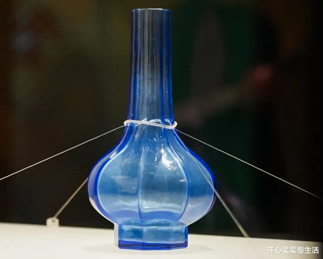 而且听说他特别喜欢蓝色的玻璃,这只透明玻璃蓝色八棱瓶色泽纯净,晶莹剔透,非常难得。或者,你可以把它理解为雍正帝的审美。