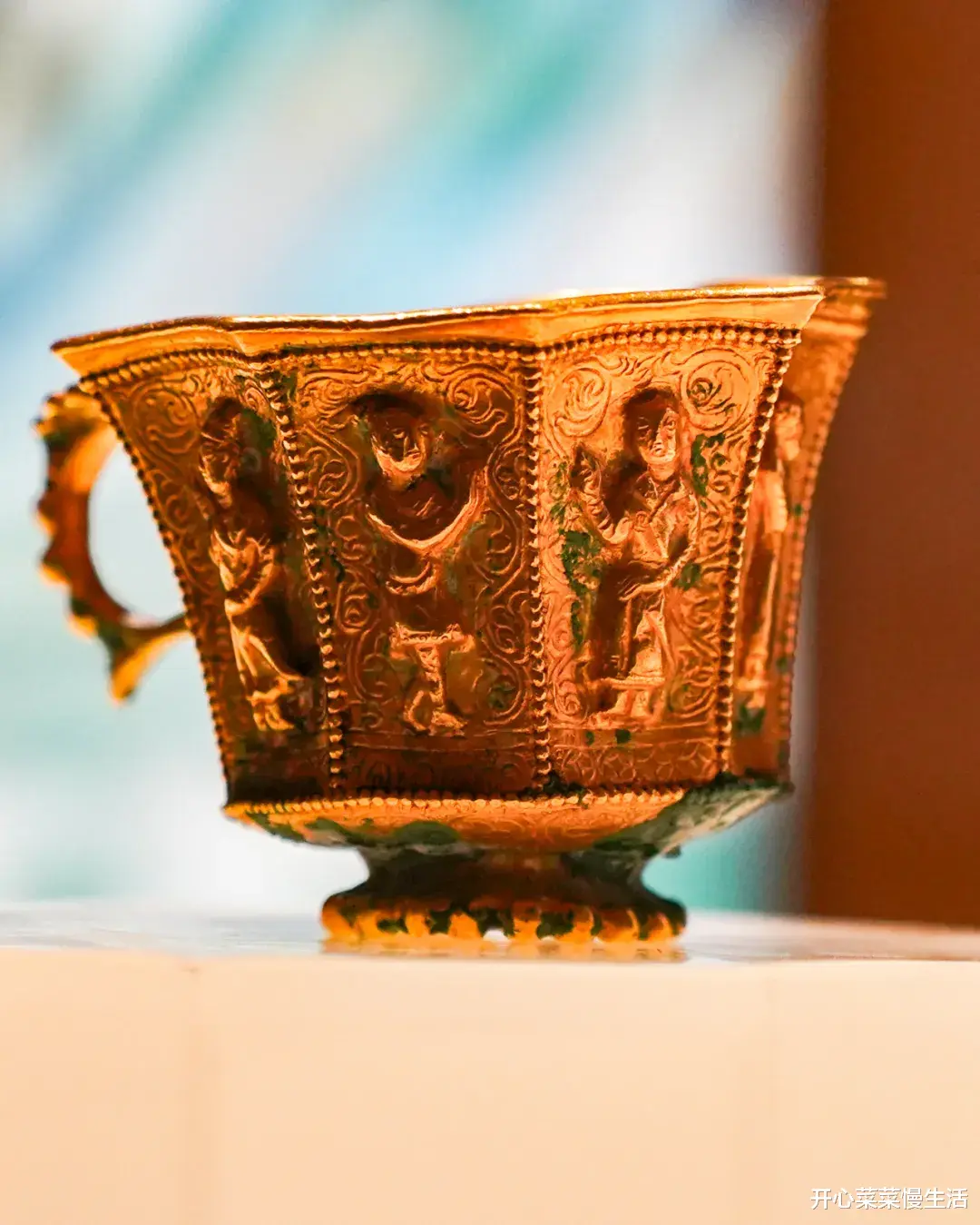 这只伎乐纹八棱鎏金杯出自唐代,杯上的图案便是粟特人的画面。