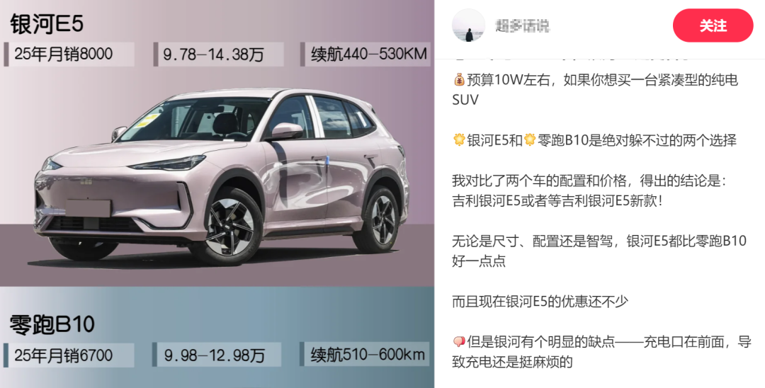 一位对比了零跑B10的网友写道,“预算10W左右,如果你想买一台紧凑型的纯电SUV,