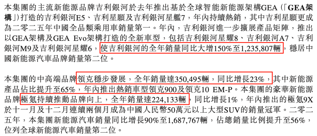 2025年,极氪销量22.4万辆、领克销量35万辆,两者合计仅占吉利总销量的19%,而中低端车型增速较快,拉低了整体盈利水平。