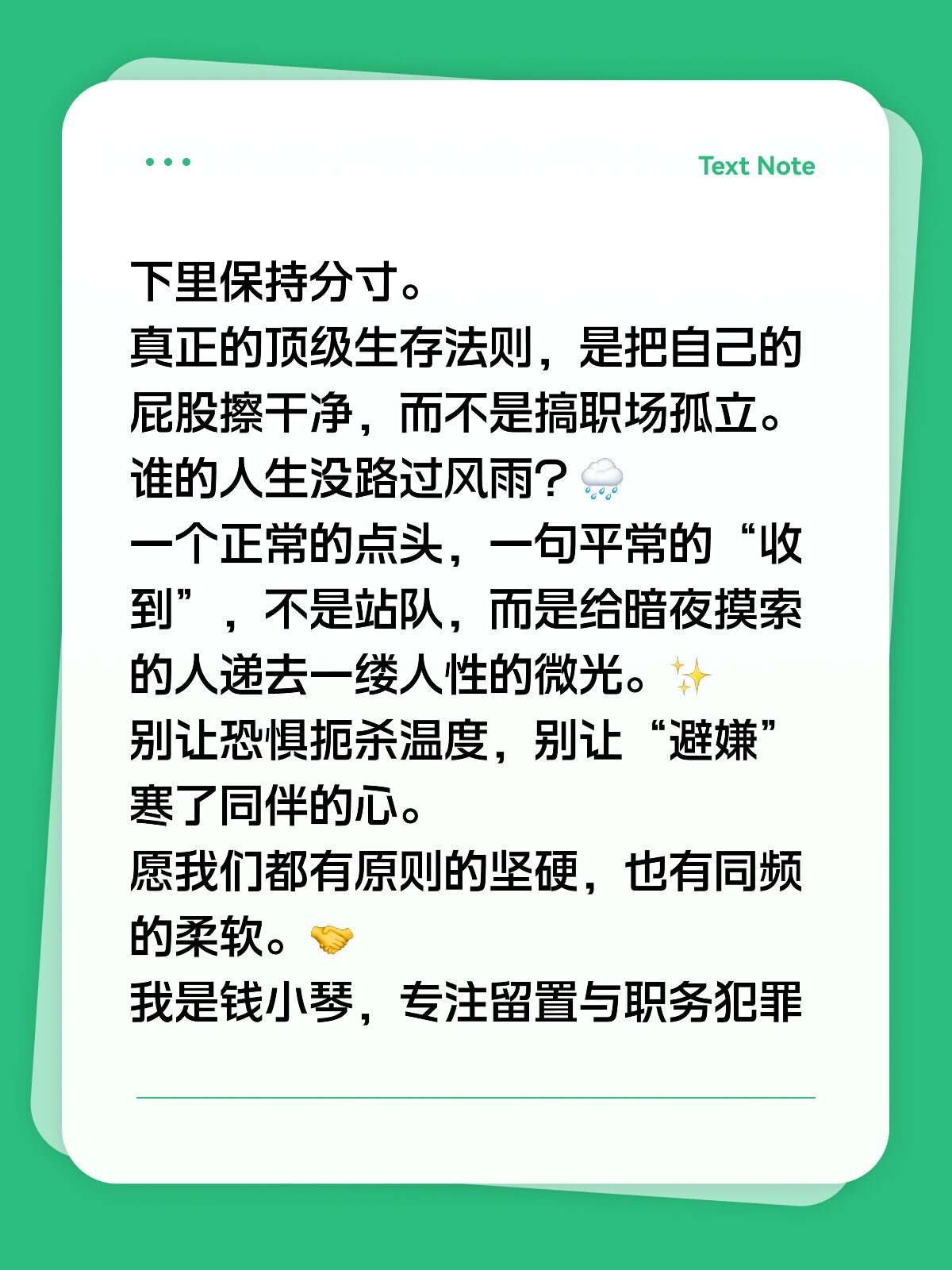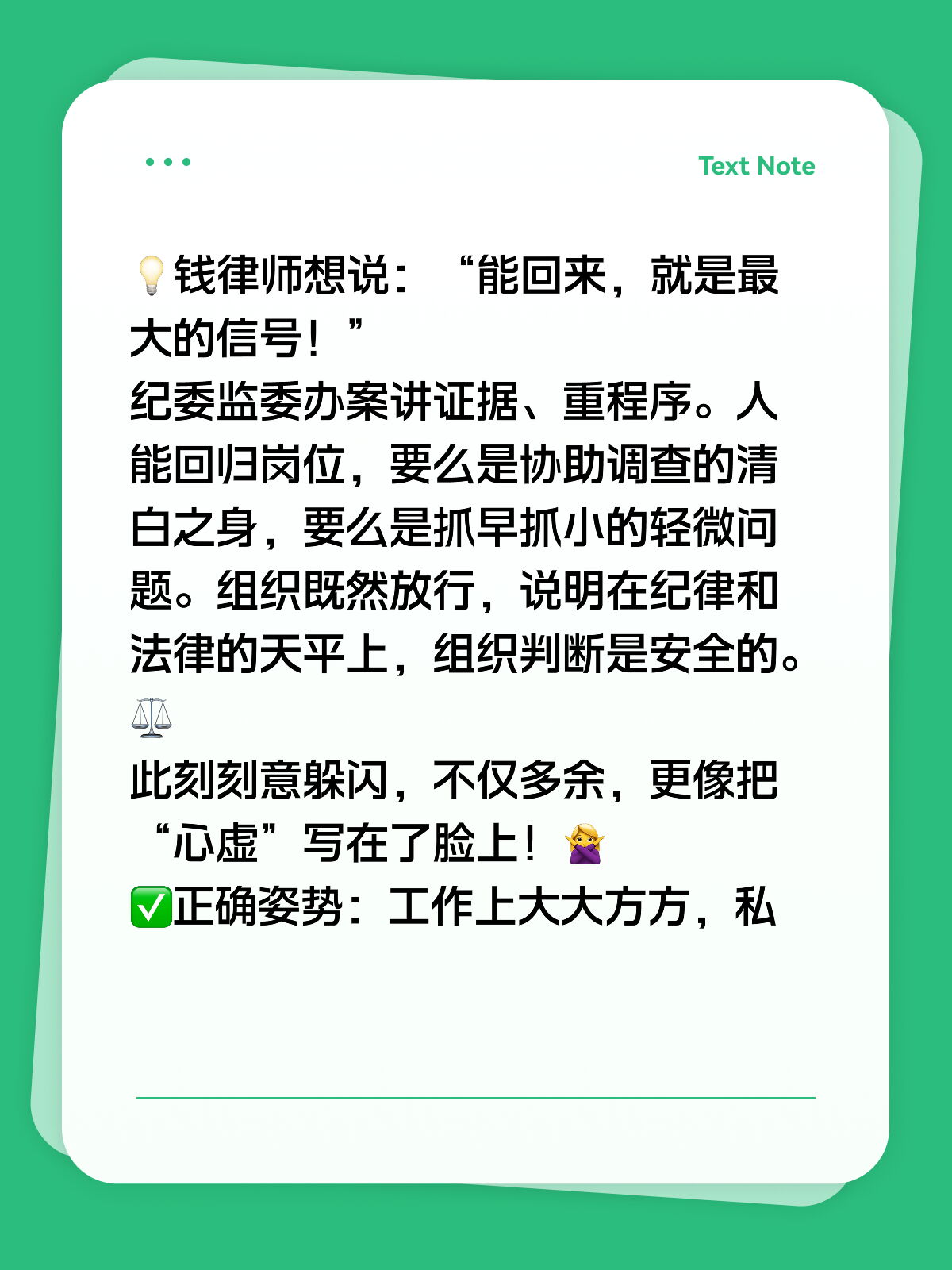 同事被纪委监委谈话后返回岗位,是该避嫌还是正常相处?杭州留置律师钱小琴深度解析“回来”背后的法律信号,探讨体制内职场的高情商生存法则与人性温度,助你厘清认知边界,从容面对职场风雨。精炼要点供快速阅读,完整版干货已发布在我账号的同系列视频中,点击头像进入主页查看,欢迎大家在评论区留言讨论。#留置律师#钱小琴律师#杭州律师#刑事辩护#职务犯罪#没有解决不了的问题#多学法律少吃亏#留置陪跑#法律咨询#省城律师#纪检监察#风险防范