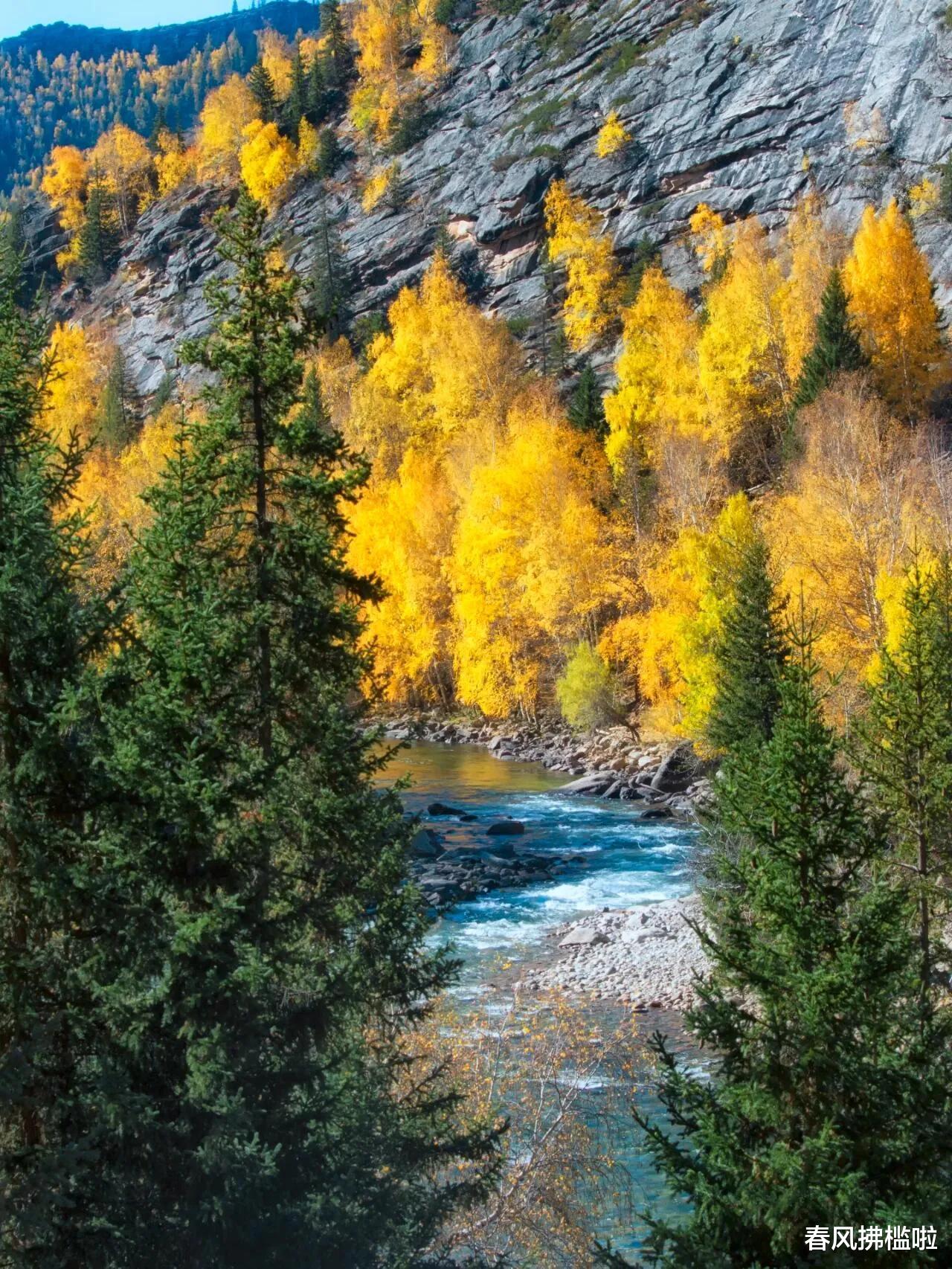 可可托海的秋色是造物主的杰作,额尔齐斯河穿行在金色的白桦林中,蓝色的河水与金黄的山林构成极致对比。