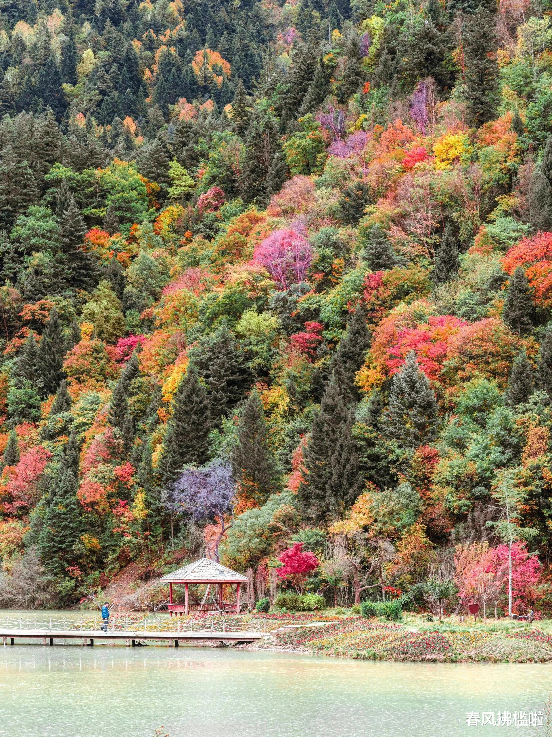 卡龙沟:被称为"小九寨",钙化池在秋日阳光下泛着蓝绿色光芒,与彩林相映成趣