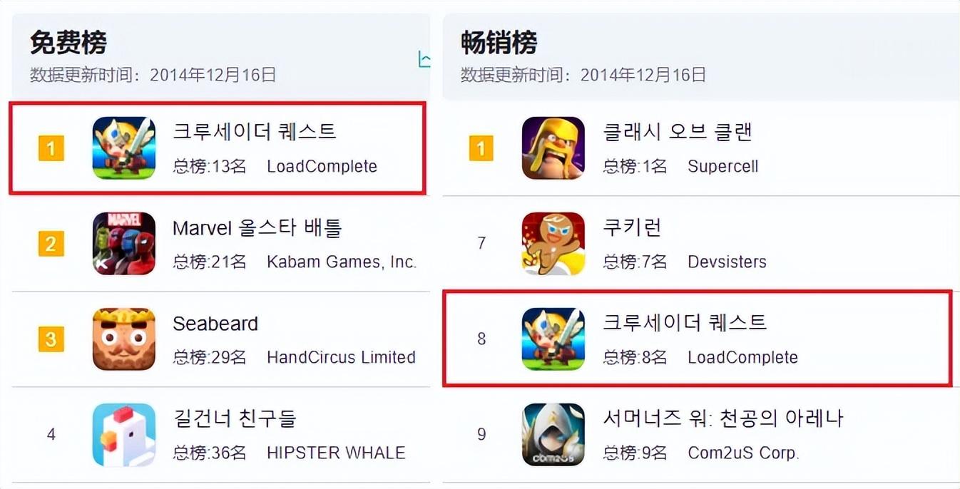 这款游戏在2014年底在韩国和全球多个市场上线,空降免费榜Top 1,并光速冲进游戏畅销榜Top 8,跟《姜饼人》和《魔灵召唤》坐一桌。
