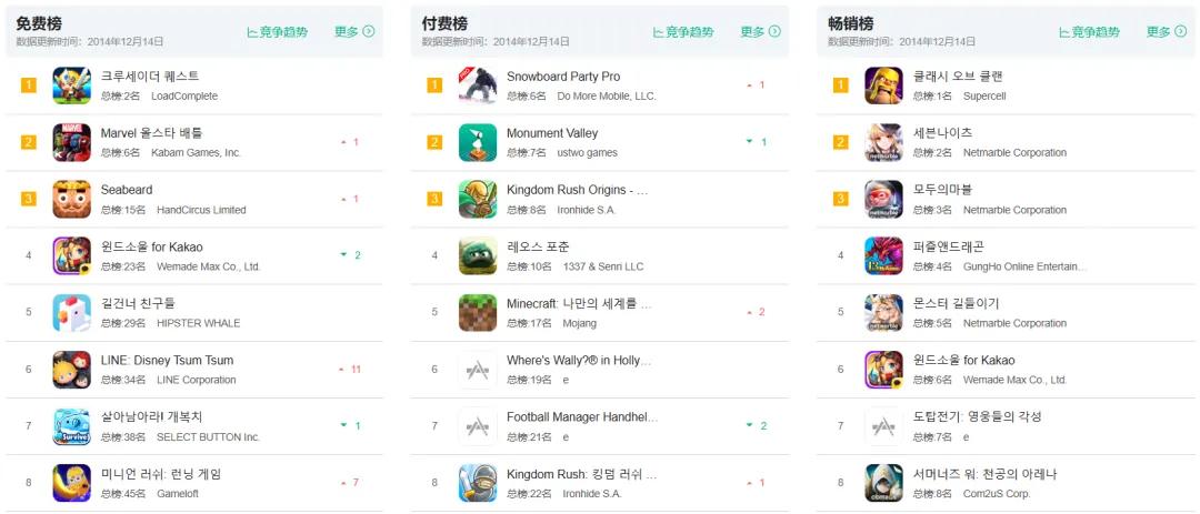 2014年前后,韩国手游市场也处于相对早期,真正的老牌IP和大厂势力还没完全下场。彼时,iOS畅销榜头部还是《部落冲突》《智龙迷城》这些外来产品的天下。
