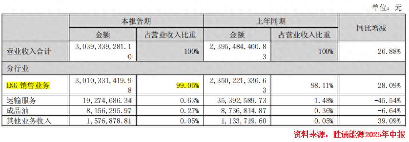 胜通能源的业务种类非常简单,说白了,就是销售天然气(LNG),2025年上半年,该业务营收占比高达99.05%。
