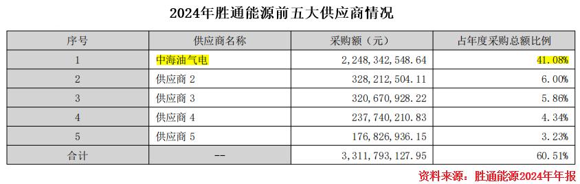 胜通能源的供应商集中度较高,2024年,中海油气电占据其年度采购总额的41.8%。