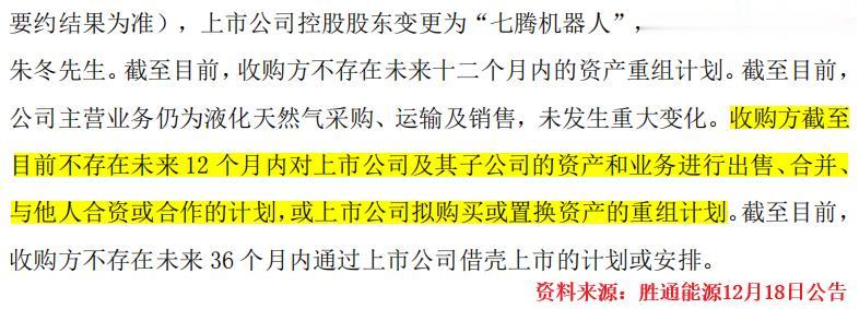 双方在交易公告中明确指出,未来12个月内,七腾机器人不会对胜通能源的资产和业务进行出售和合并等大规模改变。
