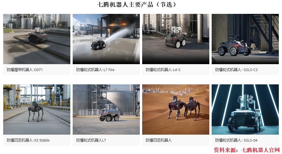 七腾机器人主要产品为防爆化工四足机器人、防爆化工轮式巡检机器人、防爆化工挂轨巡检机器人等,目前已服务于全球40多个国家及地区的上千家企业。